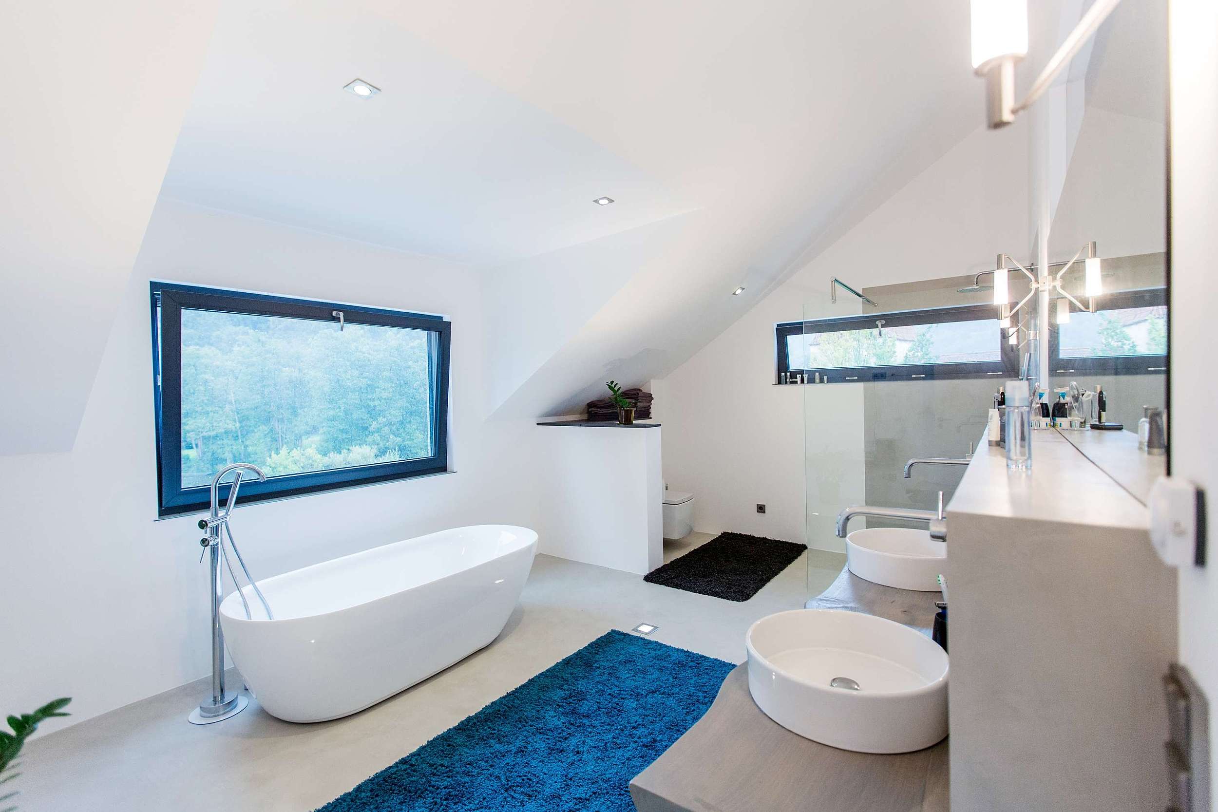 Über die Treppe gelangt man ins Obergeschoss, wo die privaten Räume liegen. Ein Schlafzimmer mit Ankleide, ein weiteres Zimmer sowie ein großzügiges Bad sind um die Galerie angeordnet. Der offene Luftraum bringt zusätzliches Licht ins Haus und sorgt für ein luftiges Raumgefühl. Ein langgezogenes Dachflächenfenster im Treppenbereich verstärkt diesen Effekt und begleitet den Weg nach oben mit Tageslicht.