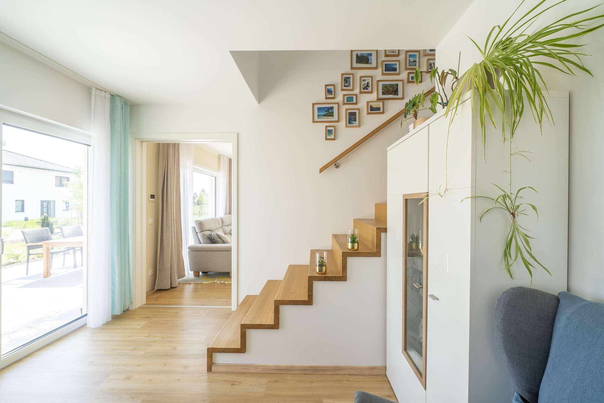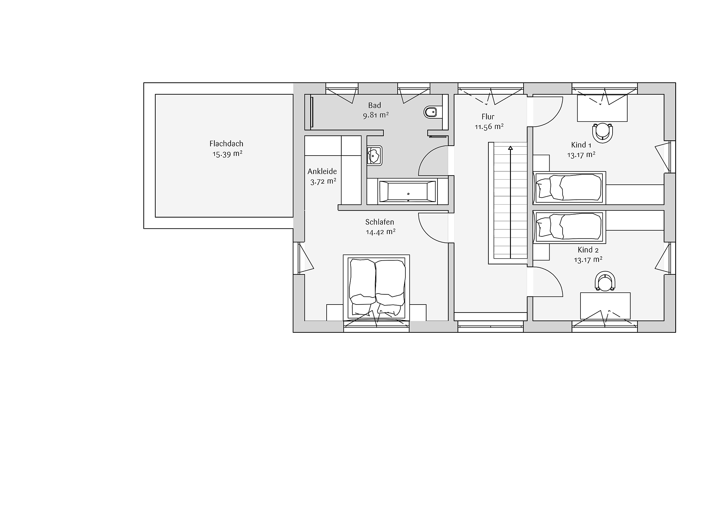 Über eine geländerlose Holztreppe gelangt man ins Obergeschoss, das die privaten Rückzugsräume der Familie beherbergt. Zwei gleich große Kinderzimmer sind klar vom Elternbereich getrennt. Das Elternschlafzimmer ist mit einer Ankleide verbunden, von der aus direkt die kleine Dachterrasse erreichbar ist – ein privater Ort im Freien. Das Familienbad ist großzügig geplant und bietet sowohl eine Badewanne als auch eine große, offene Dusche. Ein besonderes Detail ist das Sitzfenster im Obergeschoss, das als ruhiger Lieblingsplatz mit Blick nach draußen zum Entspannen einlädt. Der Grundriss verbindet klare Struktur mit hoher Wohnqualität und vielen liebevollen Alltagslösungen.