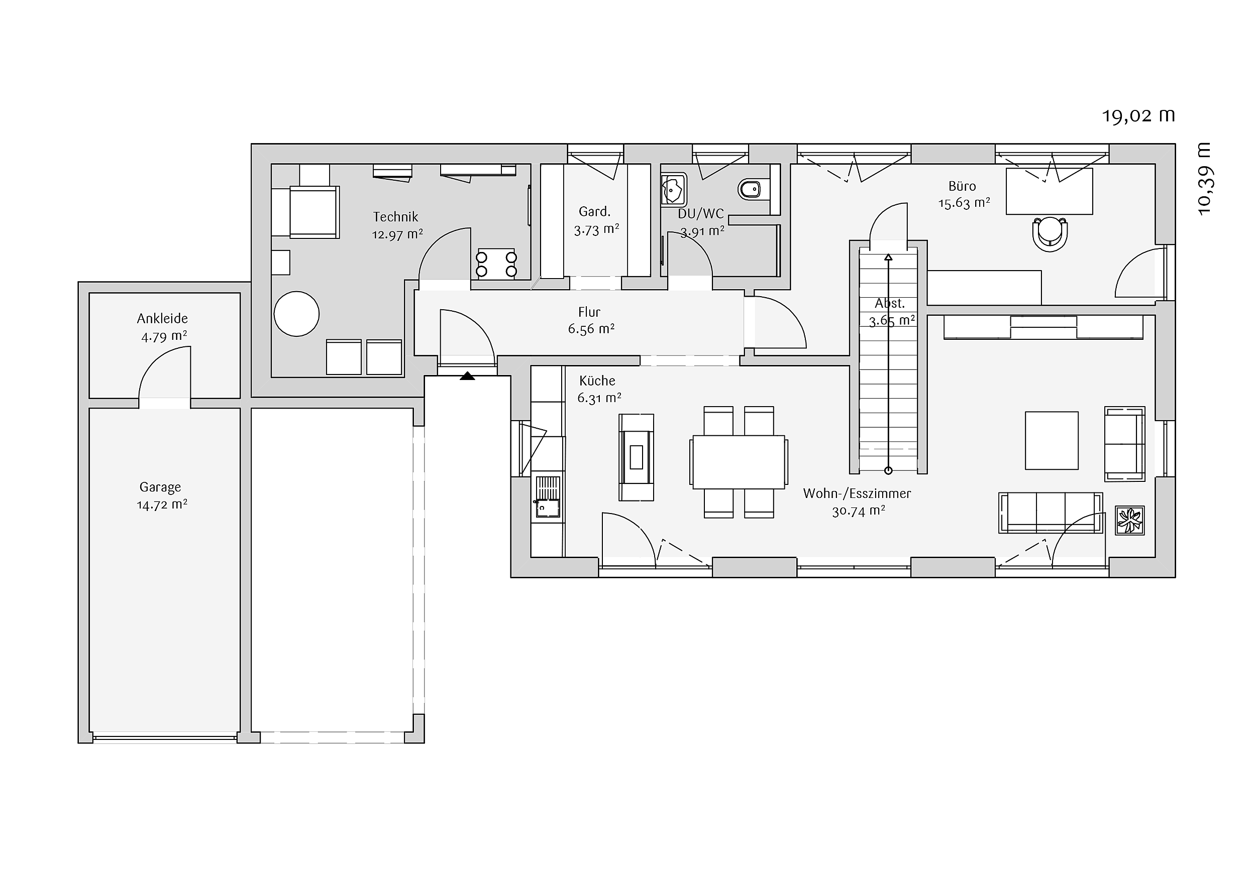 Modern 154 ist als zeitgemäßes Einfamilienhaus mit klarer, länglicher Kubatur konzipiert und wird durch eine integrierte Garage mit zusätzlicher Ankleide sinnvoll erweitert. Diese Zone dient als praktische Schleuse zwischen Außen und Innen und ermöglicht es, sich nach Gartenarbeit oder Freizeitaktivitäten direkt umzuziehen – ohne Schmutz ins Haus zu tragen. Im Erdgeschoss öffnet sich der Grundriss zu einem großzügigen Wohn- und Essbereich mit offener Küche. Das angrenzende Wohnzimmer kann über eine Schiebetür bei Bedarf abgetrennt werden und bietet so flexible Nutzung zwischen Offenheit und Rückzug. Ergänzt wird diese Ebene durch ein großzügiges Büro, eine Garderobe sowie einen Technik- und Hauswirtschaftsraum, der den Alltag funktional organisiert.