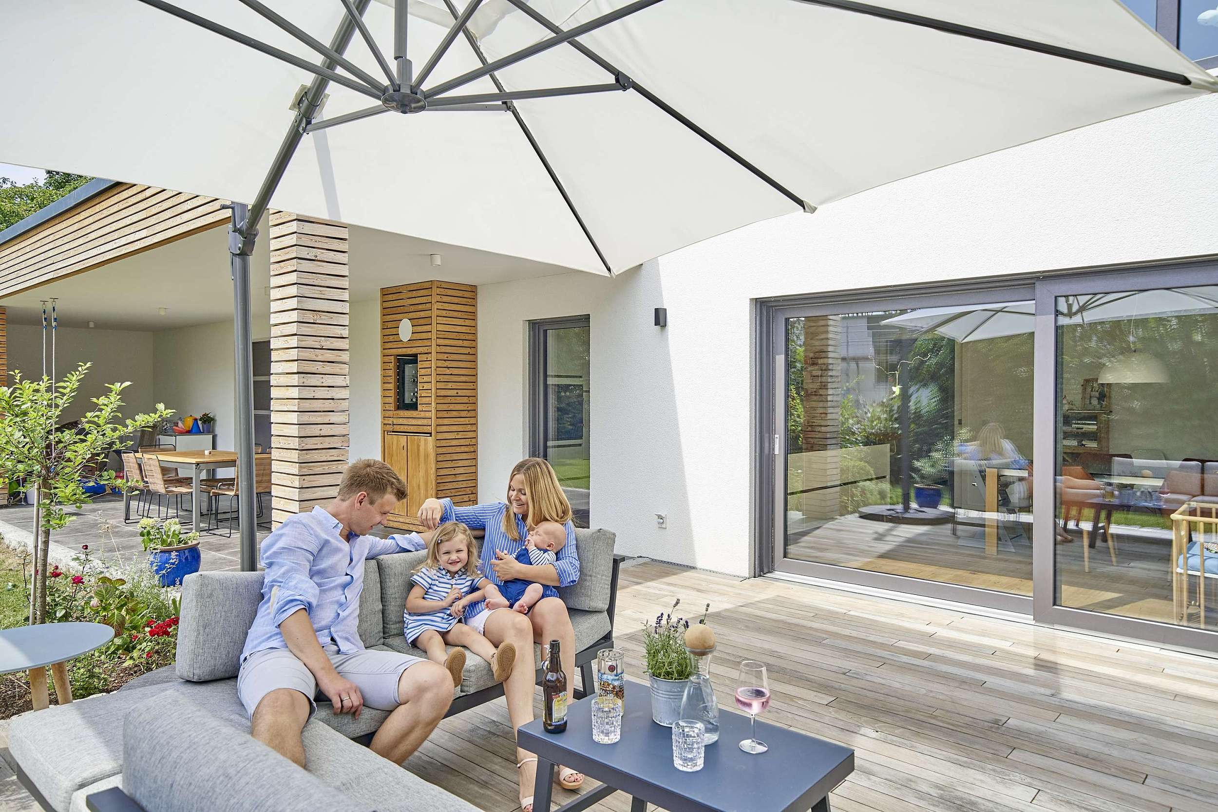 Im Erdgeschoss bildet der großzügige Wohn-, Ess- und Kochbereich das Herz des Hauses. Große Fensterflächen sorgen für viel Tageslicht und schaffen eine direkte Verbindung in den Garten. Die Küche ist offen geplant und wird durch eine Speisekammer sinnvoll ergänzt. Ein zusätzliches Büro bietet Raum für konzentriertes Arbeiten oder flexible Nutzung im Alltag. Garderobe, Gäste-WC und klare Wegeführungen machen den Grundriss besonders alltagstauglich.