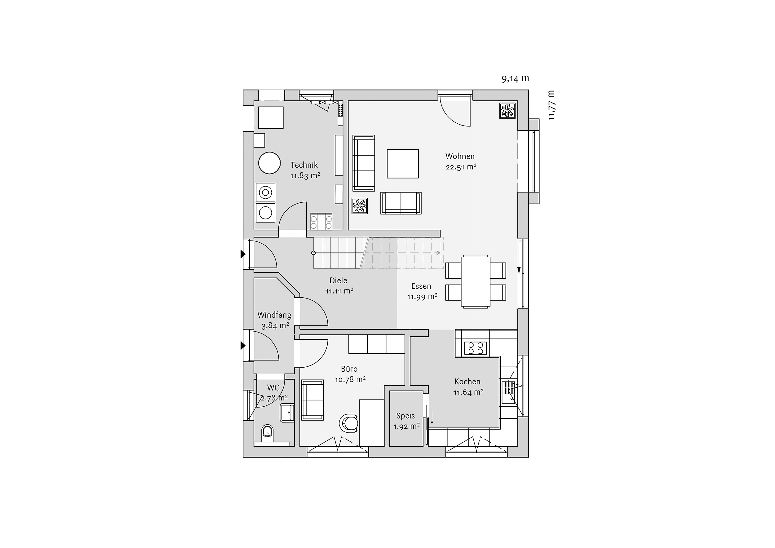 Modern 172 ist als ausgewogenes Einfamilienhaus mit klassischem Satteldach konzipiert, das Offenheit und Ordnung miteinander verbindet. Im Erdgeschoss bildet der Wohn- und Essbereich das Zentrum des Hauses. Große Fensterflächen sorgen für viel Tageslicht und schaffen eine starke Verbindung zur Terrasse und in den Garten. Die Küche ist klar angebunden und mit einer Kochinsel als kommunikativer Mittelpunkt geplant. Eine direkt angeschlossene Speis unterstützt kurze Wege und sorgt für Ordnung im Alltag. Der Eingangsbereich mit zentral platzierter Treppe strukturiert das Haus und schafft eine klare Orientierung zwischen den Funktionsbereichen. Ein zusätzliches Zimmer im Erdgeschoss kann flexibel als Büro oder Gästezimmer genutzt werden, ein separates WC ergänzt diese Ebene sinnvoll.