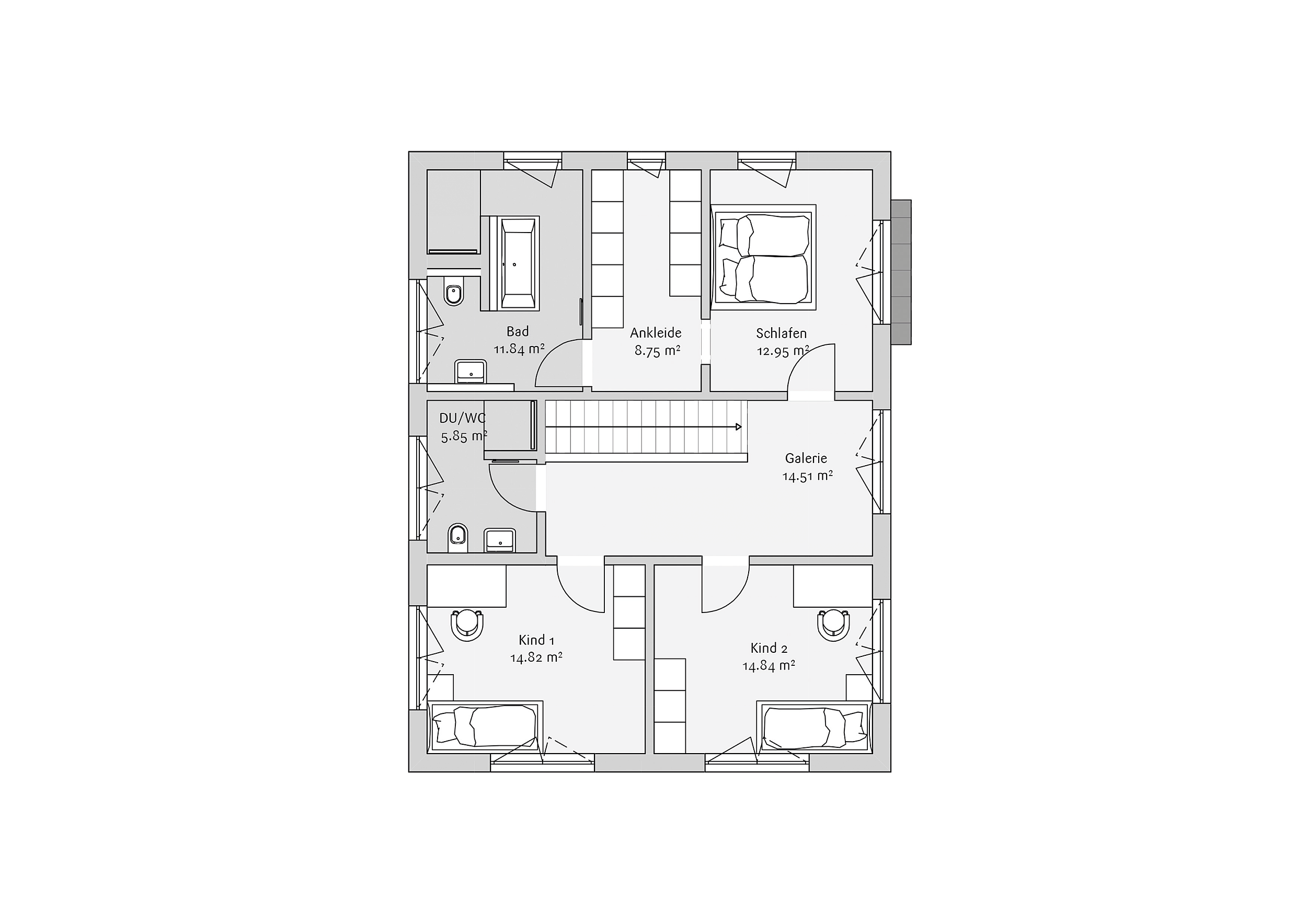 Im Obergeschoss liegen die privaten Rückzugsräume der Familie. Das Elternschlafzimmer ist mit einer offenen Ankleide verbunden und direkt an das Familienbad angeschlossen. Zwei nahezu gleich große Kinderzimmer bieten ausreichend Platz für individuelle Bedürfnisse. Die Galerie verbindet alle Räume, ohne sie zu vermischen, und bringt zusätzliches Licht in die Mitte des Hauses. Der Grundriss ist klar gegliedert und auf langfristige Nutzung ausgelegt – mit ausreichend Flexibilität für unterschiedliche Lebensphasen.