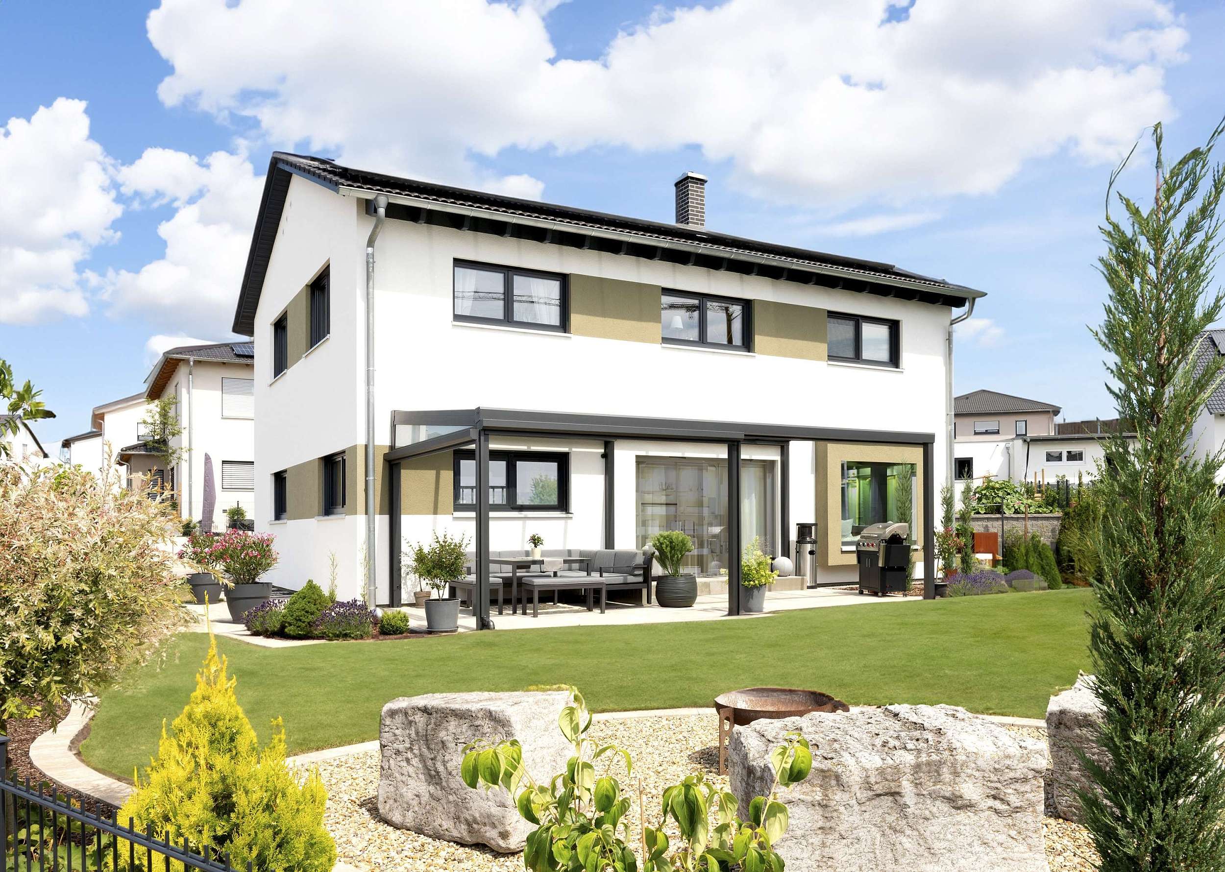 - Klassische Satteldacharchitektur mit moderner Raumorganisation