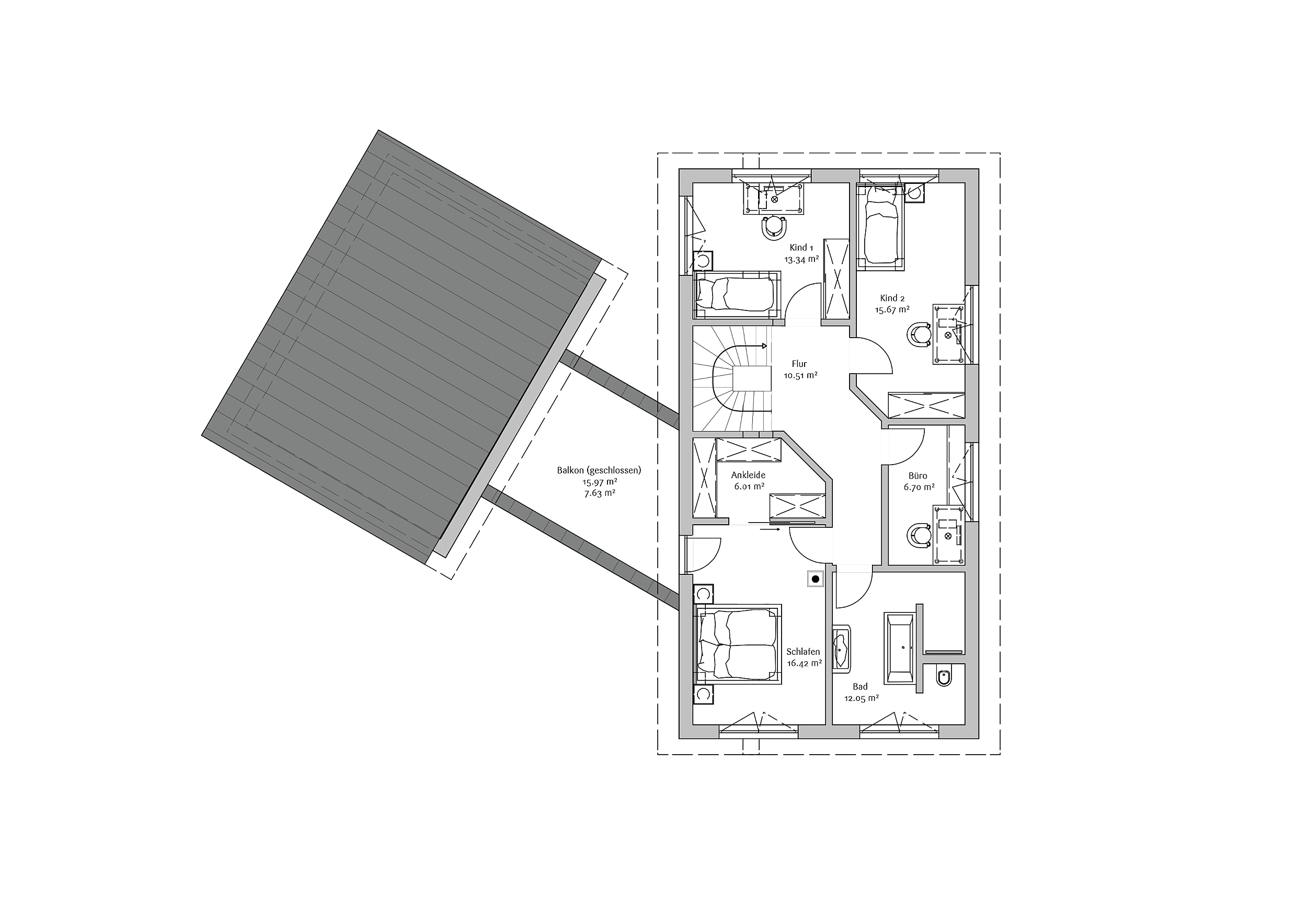 Der Arbeitsbereich ist separat erschlossen und ermöglicht konzentriertes Arbeiten, ohne den privaten Wohnbereich zu stören. Im Obergeschoss befinden sich die privaten Räume mit Elternschlafzimmer, Kinderzimmern, Bad und zusätzlichem Büro. Der Grundriss ist auf langfristige Nutzung und flexible Lebensmodelle ausgelegt.