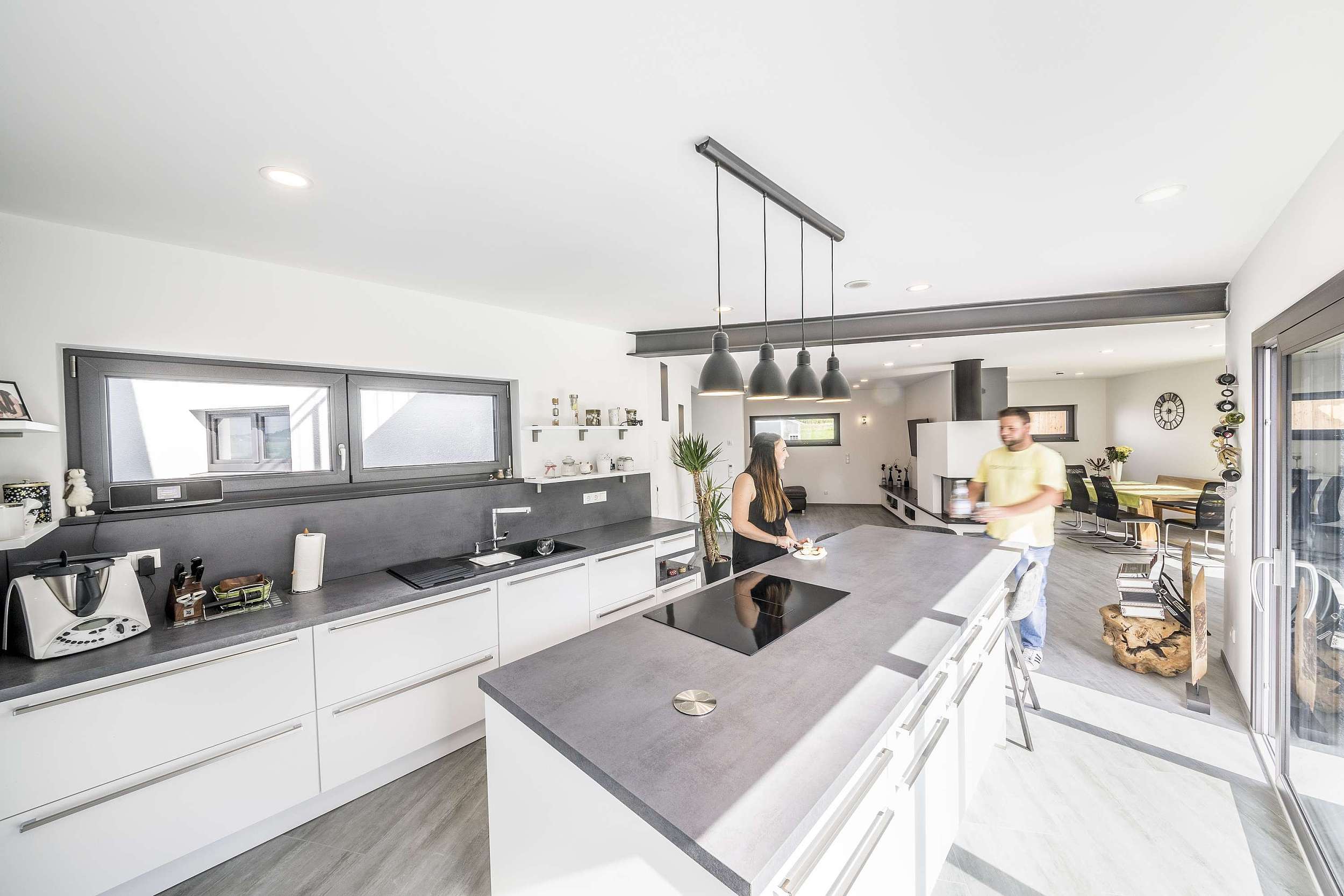 Modern 240 ist ein Einfamilienhaus mit integriertem Arbeitsbereich. Im Erdgeschoss sind Wohnen, Essen und Kochen offen angeordnet und klar zoniert. Große Fensterflächen öffnen den Wohnbereich zum Garten. Die Küche mit Insel ist funktional eingebunden und bildet das Zentrum des Familienlebens.