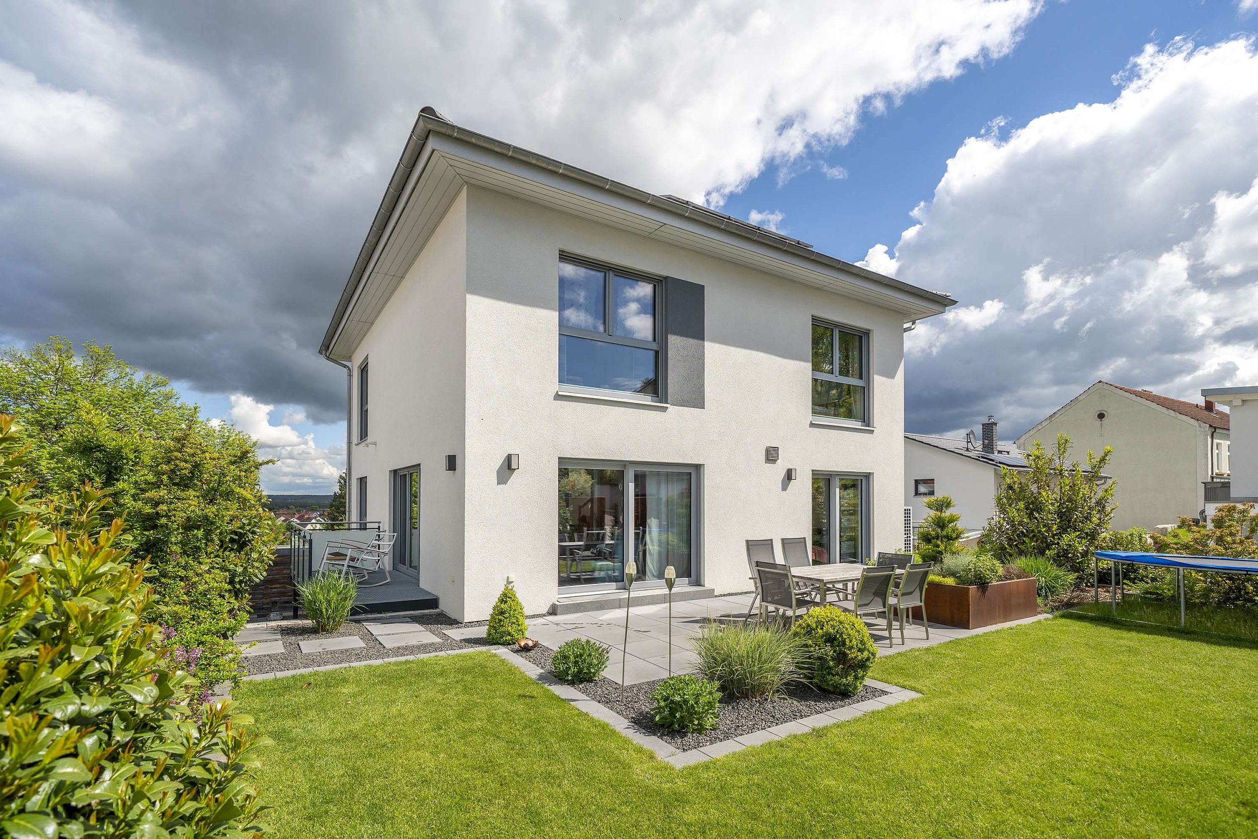 Die Stadtvilla glänzt mit klar gegliederten Bereichen für Alltag und Rückzug. Im Erdgeschoss bildet der offene Wohn- und Essbereich das Zentrum des Hauses. Große Fensterflächen schaffen helle Räume und stellen eine direkte Verbindung zum Garten her. Die Küche ist funktional integriert und bietet kurze Wege im täglichen Leben.