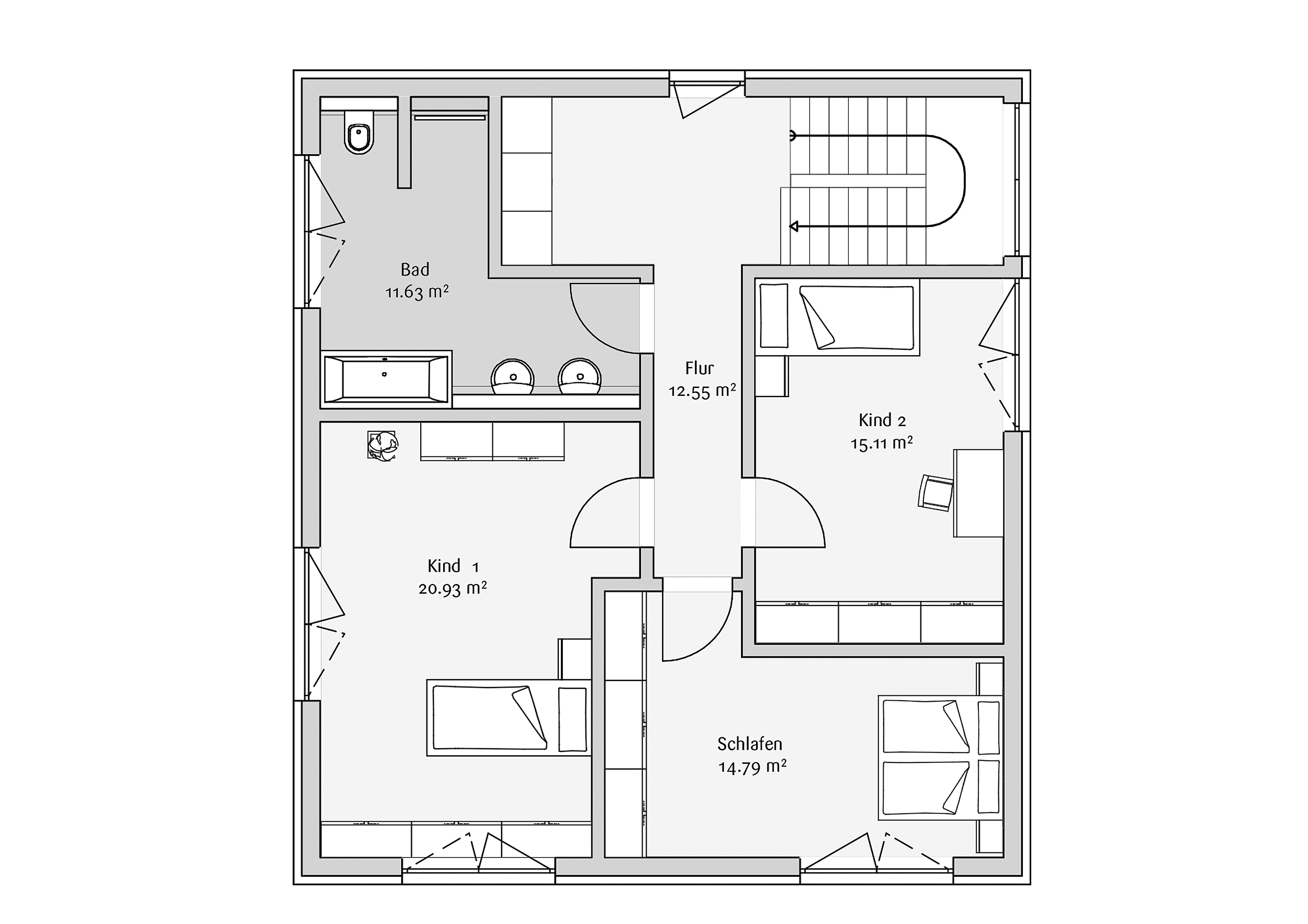 Im Obergeschoss liegt der private Bereich. Hier entstehen Rückzugsräume für Eltern und Kinder mit klaren Strukturen und angenehmen Proportionen. Ein großzügiges Bad sowie ausreichend Stauraum ergänzen die Ebene und sorgen für Komfort im täglichen Leben.